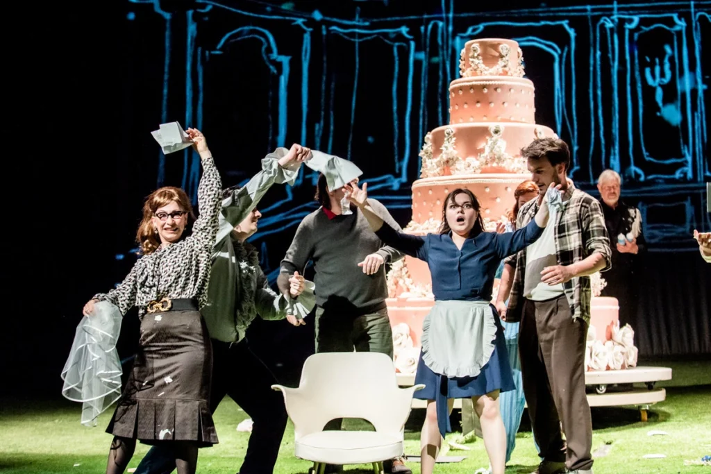 A už hrajeme, je premiéra 9. června 2023. Začínáme do ticha. Benzínová sekačka jede po trávníku, možná až příliš dlouho, ale pak konečně škytne a Zahradník ji musí znovu nastartovat. V orchestřišti začíná předehra. Hrabě podniká v nemovitostech, a tak daruje Zuzance a Figarovi jako svatební dar jeden s rodinných domků na tom posekaném trávníku. Tam mezi domky se odbývá první scéna zamilovaného páru a také ta milá hra na schovávanou mezi Zuzankou, Cherubínem, Hrabětem a Basiliem – a tak je kam se tiše skrýt. Potom už jsme ale potřebovali aspoň dvoje dveře pro hraběnčin pokoj, a tak jsme si pro ně zavolali. „DVEŘE!“ A už tu byly i s prostorovým „kresleným“ plánkem. No úplně to nefunguje, tak s tím trošku zatřeseme, dveře otočíme. A teď scénka Hraběnky, Zuzanky, Cherubína a Hraběte, který je vyrušil. Cherubín musí skočit do kanálu – tedy do propadla, neboť nám chybí okno. Nevadí, to je schválně, je to jen hra. Komická? No, to moc ne. Ale teď do toho nudného Mozarta vložíme trochu osvěžení. Je libo harmoniku, kytaru, písničku? Černobílé válečné filmové dotáčky? Všechno bude! Tady můžeme cokoli. Jó v době svého vzniku se Figarova svatba nemohla hrát, protože byla příliš revoluční. Sluha Figaro se bouřil proti pánovi. Tak o to už dneska vůbec nejde. Teď je to jinak – podnikatel proti lidu a opačně, žádná idyla, dojde na kopance do ležícího, na plivance, půjde to až na krev. Zuzanka že by měla být věrná? Nesmysl. Taková obyčejná kuchta si to rozdá s každým. S bohatým podnikatelem určitě! Figaro je v tom jednom našem černobílém filmu zraněn do paže, kterou si pak ve chvíli, kdy je ve stresu, rozškrábe, až mu bohatě teče červená. A Hraběte v posledním jednání zmlátí objednaná parta. Zkrvavená košile – no pěkně ho ti hoši zřídili. Dnešní doba je drsná, pánové a dámy, dámy a pánové, tak proč ji nenechat vniknout do Figarky, když JÁ to tak chci.