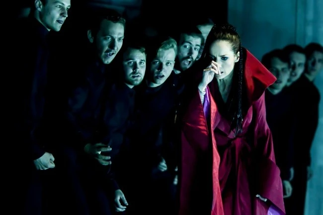 Neodmyslitelnou zásluhu na kvalitním provedení má sbormistr Josef Pančík, který operní sbor NdB za svoje dlouholeté působení dovedl k prestižním výkonům v mnoha inscenacích a korunoval jej jak v Turandot, tak právě nyní, kdy měl se svými kolegy (Michal Vajda a Valerie Maťašová) na starosti přes dvě stovky pěvců včetně dětských zpěváků (Dětský sbor Brno), různě se po hlasových skupinách přemisťujících nejen na jevišti, ale i v hledišti. Obdobné rozvržení, tedy umístění sboru do lóží, bylo k vidění i v pražském Národním divadle (Sbor Národního divadla, Pražský filharmonický sbor a Kühnův dětský sbor), nepůsobilo ovšem zdaleka tak silným dojmem, jako právě v Brně.