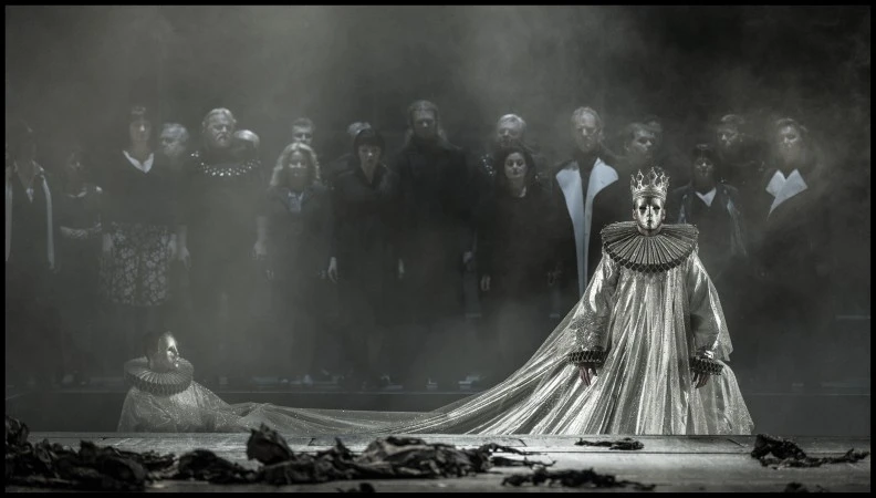Režisér Martin Čičvák usiloval o koncepční prostotu, o jasnost a srozumitelnost inscenačního jazyka. V Macbethovi má velmi významnou roli sbor, pro který inscenátoři zvolili nevýrazné několikavrstvé oblečení lidí, které jsme nepříliš dávno mohli potkat na ulici. Veškeré kostýmy oscilují mezi bílou, černou a šedou (Marija Havran) a scénografie vsadila na černé odhalené jeviště, které je horizontálně vyhloubeno do obdélníkového tvaru a obsahuje u obou delších stran tři různě hluboké schody (Hans Hoffer). Sbor se tedy může podle potřeby divákům ztratit z očí, může být do této prohlubně částečně ponořen. Také král Duncan schází po schodech dolů do nitra scény a tam se odehraje jeho vražda, skryta očím diváků. A také ten klesající balvan, který visí nad jevištěm, by mohl klesnout ještě mnohem hlouběji, kdyby se mu to dovolilo. Sbor jako by vypolstrovával ten kráter v zemi.