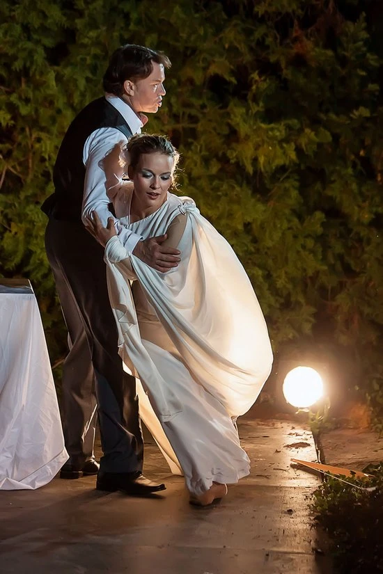 Elegantní soudobé kostýmy Lenky Poláškové signalizovaly publiku od počátku nejen přenesení příběhu do dnešní doby, pro více zasvěcené do Dvořákova díla i širší inscenační posun a interpretační výklad akcentující více mezilidská jednání než pohádkový svět vodní říše, svět přírody a lidí. Jiří Heřman nabídl divákům barevnou a stylovou čistotu architektonického řešení, mnoho detailních prvků korespondovalo podél točny se scénickými obrazy, které divák viděl v předchozích výstupech. Symbol květů leknínu měl své pevné místo nejen v zámeckém parku, ale i na Bellarii, jejíž víceúrovňová stavba se schodištěm paralelně ladila s bílou jednoduše řešenou cestou či molem na opačné straně. Metafora vody, ponechána logicky na fantazii diváka, byla neodmyslitelně spjata nejen s lekníny rozestavěnými v jedné části parku, ale i s Bellarii, která byla působivě oživena vizuální projekcí přinášející rozmanité obrazy proudění vody a pohybů plovoucích postav. M. Santiago využila v souladu s hudebním děním principy kontrapunktu, opakování i protipohybů výstižně a efektně.