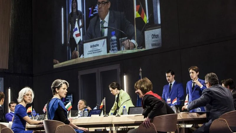Evropská unie prožívá v současné době těžké časy a tak proevropští tvůrci opery umístili příběh krále Mitridate a jeho dvou synů do rychle svolaného krizového summitu unie. Tak skončili návštěvníci opery na téměř čtyři hodiny v impozantní kancelářské budově. Pohodlné řešení, protože s touto omezenou výpravou – jen několik vchodů a velký konferenční stůl – se obešla technická omezení i nedostatek místa. A co se nevešlo na scénu se promítalo do hlediště kde bylo zavěšeno 28 evropských vlajek, ke kterým přidali vlajku zchátralého království Pontus. Příběh byl pravidelně doplňován zprávami televizní stanice „Pontus News“ na mnoha obrazovkách v sále.