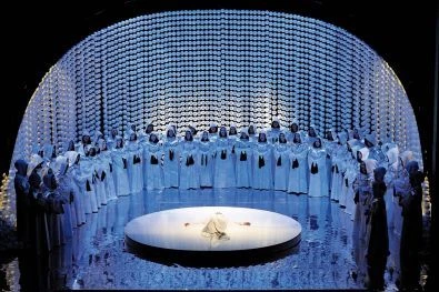 Předností Roccovy koncepce je jevištní přesvědčivost závěru 3. dějství, handicapem však režisérova scénografie, která sborové scény 1. a 3. dějství sevřela krunýřem půlkruhového závěsu ze stovek zavěšených bílých plastových koulí, chtě nechtě připomínajících normalizační bytovou estetiku a neposkytujících adekvátní prostor sborovým scénám. Sboristé tak na scéně po většinu času stojí, opatrně přešlapují hledajíce své místo na jevišti, a to v rozporu s Wagnerovou dynamickou a akční hudbou hromadných scén. K vstupu a odchodu z jeviště musí sboru většinou sloužit jen portály. Vedle pohyblivého závěsu plastových koulí, jehož přednosti odhalila světelná režie první poloviny 2. dějství, která patřila k vizuálně nejpůsobivějším částem inscenace, jsou jedinými objekty na scéně dva kruhové artefakty, zavěšené slunce-měsíc a centrálně situovaný ring, v němž se odehrávají zápasy duše i těla. Režisérovy dálněvýchodní inspirace nejviditelněji prozrazují líčení a kostýmy (zvláště samurajský oblek Telramundův), z nichž nejnelichotivěji působí paraliturgický kostým Lohengrinův, působivěji variované kostýmy Elsy a Ortrud, oba potřísněné „špínou tohoto světa“.