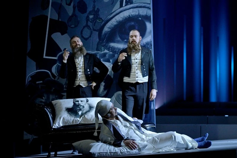 Svou nezastupitelnou roli hrají ve scénografii dva plošné scénické panely, které (byť i s určitými technickými nedokonalostmi) přijíždějí v závěsu nad podlahou, aby doplnily scénografickou koláž o náznak prostředí, v němž se hraje. Doslova kouzelné je piano – tedy jen jeho vztyčené křídlo, pod nímž (pod úrovní jeviště) odpočívá starý směšný Kníže obklopený polštáři s Dostojevského portréty. Neustále myslíme na autora povídky Strýčkův sen, Michajla Fjodoroviče Dostojevského. Jeho podobizna je od počátku umístěna uprostřed proscénia, trůní na polštářích, jeho podobu nese jako masku na hlavách balet, který se periodicky vrací na jeviště (choreografové Yago Catalinas Heredia a Jana Tomsová). Také kostýmy Marty Roszkopfové nesou znak koláže, rozhodně se nedá říci, že by byly výlučně zakotveny v devatenáctém století. To vévodí střihově spíš u vedlejších dámských postav a u dámského sboru (sbormistr Jurij Galatenko). Zina je jednoduchá běloskvoucí, její ctitel Pavel je přebarevný až klaunský, intrikánská Nastasja je superrůžová, opilá Sofie Petrovna doslova rve oči svou jedovatou zelení.
