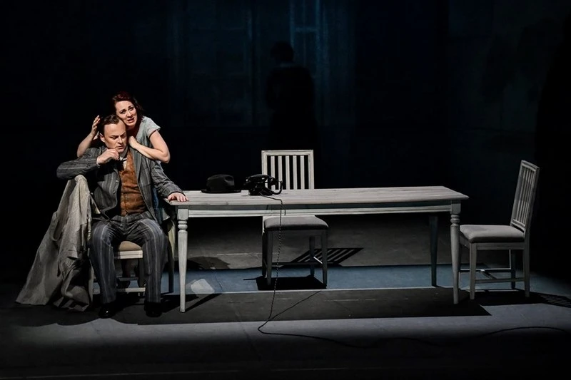 Ne tak v této inscenaci. Celé dějství se odehrává v otevřeném bytovém prostoru (40., 50. léta?), les tedy není přímým dějištěm jako v opeře, ale temným neznámem, které tiše čeká za dveřmi bytu. Michel a Juliette působí jako manželský pár středního věku, oba velice civilní, Michel nápadně sebekontrolovaný, přesto se jejich replikami šíří do hlediště tíseň. Proč tíseň, když Julietta je většinou hravá, snová, lákavě proměnlivá? Protože v kontextu normálnosti a vážnosti obou protagonistů nabírají pronášené repliky obsah absurdity nikoliv komické, ale život a zdravý rozum ohrožující, absurdity toxické pro jejich i vaši realitu. Civilní dvojici obklopuje sice v každém jednom přítomném okamžiku reálný interiér, ten se ale v nuancích a jemných šerosvitných detailech umí v průběhu času proměňovat (scéna David Radok). Do něj vstupuje několik málo epizodních postav, které Martinů ve Fragmentech nechal, a mrazivě samozřejmým způsobem narušují osobní prostor obou. Kdo je tady blázen? Juliette? Obchodník, který se tu chová jako doma? Vy?