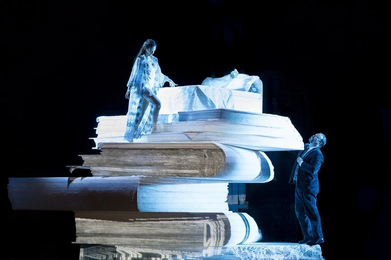 V době, kdy básník sepisuje své velké dílo, bloudí mladý pár kdesi vysoko v horách a následně umírá uprostřed zimy a ledu. Zvětšeniny lampy, psacího stroje, mužského torza, lidské hlavy nebo hromada knih, na jejímž vrcholu je básníkova postel, jsou současně předměty z jeho psacího stolu, ale také dekorace či kulisy horského hotelu a dění v něm. Režisér Keith Warner si pohrával se symbolikou příběhu na pozadí k tomu stvořené scény z dílny Es Devlin, která je jeho dlouholetou spolupracovnicí a symbióza obou umělců byla na výsledku znát. Obrovské bílé předměty na pozadí černé scény, otevřené či ohraničené, byly plně funkční, symbolické; ledové prostředí horského hotelu. Kostýmy Toma Randa vycházely z dobového oblečení příběhu kolem roku 1910 a tradičního oblečení rakouských horalů. Ocitáme se v jakémsi pseudouměleckém, protože bezcitném prostředí, takže závěrečná scéna slavnostní recitace nové básně pro rozhlas vyzní naprosto prázdně.