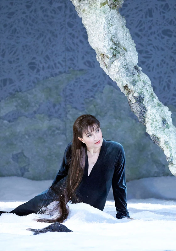 Lyrickou pohádku o třech dějstvích na libreto Jaroslava Kvapila prozářil scénograf chladnou poetickou atmosférou. Jeho centrální dvouúrovňové řešení s velkou, hrubě opracovanou, šedou dekorací rámující zadní scénický prostor bylo funkční a jevištně účinné. Příčné dělení strohého půdorysu na syrově působící hrací plochy se zamrzlými skly, kašírovitými krystalickými nánosy sněhu a vlnitými vyschlými kmeny stromů jasně demonstrovalo převládající emoce naplněné bolestí, neštěstím a tragikou. Prostředí zámku a možnost souhry partnerského vztahu mezi Princem a Cizí kněžnou zvýraznil scénograf i kostýmní výtvarnice kombinací jasných chladných a teplých barev s klasickými kostýmy. Světelný designér Jürgen Hoffmann výtečně podpořil obrazy s metaforou pohádky i mrazivých snů.