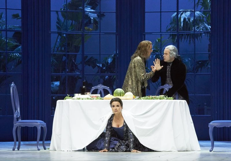 Inscenátoři opery Cosi fan tutte – režisér Sven-Eric Bechtolf a scénografové Rolf Glittenberg (scéna) a Marianne Glittenberg (kostýmy) – se rozhodli vymanit z „prokletí aktualizace“ a příběh sázky na věrnost sester Fiordiligi a Dorabelly ponechali v historické době, v dobových kostýmech i dekoraci. Na jevišti dominoval velký skleník, jakási zimní zahrada s palmami, oleandry a dalšími exotickými květinami a ještě k tomu s bazénem uprostřed, který byl v řadě situací vtipně a nápaditě využit. Hned při předehře se tu obě sestry za asistence komorné koupaly, později si tu filozof don Alfonso osvěžoval své nohy. Skleník byl na točně a tak bylo možno z druhé strany položit svatební stůl i další nábytek odpovídající vývoji děje. Do bazénu také mrštila rozzuřená Dorabella kávovar, ten se rozpadl na kusy a poté jeho součásti komorná Despina síťovým naběrákem obtížně vytahovala z vody. Kostýmy nebyly sice rokokově „načančané“, spíše klasicistně střídmé, ale rozhodně odpovídaly době konce 18. století. Tedy době, kdy opera vznikla. Sama režie sice v komických situacích nápaditostmi příliš neoplývala, byly však přehledné a měly svou logiku. Převleky mladých důstojníku za urozené Albánce byly spíše decentní, zato však převleky komorné Despiny za doktora a posléze notáře už díky své představitelce Martině Jankové upoutávaly hyperbolizovanou nadsázkou a tyto scény, jako by vystřižené z commedie dell´ arte se staly komediálními vrcholy inscenace. Dobře bylo využito rovněž v nepočetných scénách sboru a komparsu. Těžiště ovšem leželo na jednotlivých představitelích a představitelkách, všichni s evidentním gustem vychutnávali komediální peripetie sázky, kde v celé paletě výrazů přiblížili typické vlastnosti mladých milenců, mužskou ješitnost i ženskou přelétavost, tedy hlavní téma opery, kdy zapřisáhlá láska se rozplývá díky podlehnutí hříšným svodům. Martin Mitterrutzner (Ferrando) akcentoval lyrickou roztouženost, zatímco Luca Pisaroni (Guglielmo) cynickou světáckost a dravost, rovněž tak psychologicky odlišně charakterizovaly pěvkyně postavy obou sester – Malin Hartelius (Fiordiligi) citovou nezlomnost a zásadovost, aby pak o to nečekaněji vyznělo její selhání, naproti tomu Marie- Claude Chappuis (Dorabella) působila živelně, až s hysterickou sveřepostí nemajíc ovšem daleko k frivolnosti a dychtivé neukojenosti. Dominantní pozici rezonéra si po celý večer udržel Gerald Finley (don Alfonso), jakož i už zmíněná Martina Janková jako Despina si přišla pěvecky a herecky na své a tak obhájila své již dosažené místo ve svém oboru.