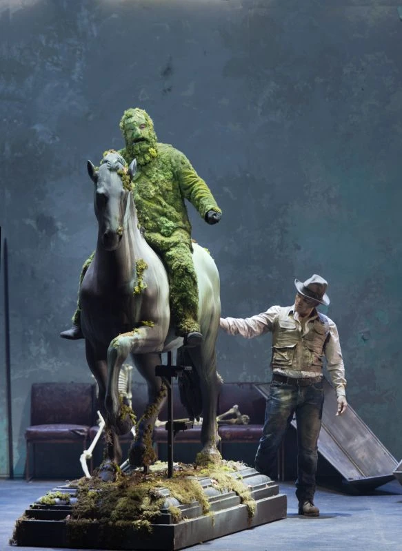 Opera nemá plynulý děj, je rozložena do řady kontrastních scén a volně na sebe navazujících epizod, takže celek působí spíše jako takový kaleidoskop groteskních, absurdních situací. Nejdůležitější je atmosféra prostředí potemnělého hradu, ponurých nocí a strašidelných zjevení. Tajuplná a přízračná scenerie hradního nádvoří s řadou výmolů a hrbolů, kde se za bouřlivé noci otevírají rakve, nebožtíci stávají z hrobů, tajemní rytíři, celí zarostlí, zaprášení a zamračení, a ženštiny s rozcuchanými vlasy se promíchávají se sluhy a zuboženými, umolousanými bezprizornými tuláky. Dílo přináší totální obraz apokalypsy, inscenace to ještě zvýraznila. Díky režii (Alvis Hermanis ) a scénografii (scéna: Alvis Hermanis , kostýmy: Eva Dessecker ) postihla genialitu díla se vším všudy. Nezapřelo se, že režisér byl zároveň i výtvarníkem scény. Potemnělé scéně dominují hradby středověkého hradu s vysokou bránou a padacím mostem uprostřed, na levé straně vidíme siluetu někdejší továrny, na pravé straně vrakoviště aut a před nimi na hromadě odpadků sedí čarodějnice Morgan le Fay. „Zelený rytíř“ vjede na nádvoří na obrovské maketě dřevěného koně na podstavci na kolečkách. Sbor i sólisté jsou částečně v dobových kostýmech, částečně v aplikacích dnešních oděvů. Jako by vše – a nejen rytíři – bylo pokryto zelenavým mechem, jako by vše prostupoval trouchnivějící rozklad a plíseň.