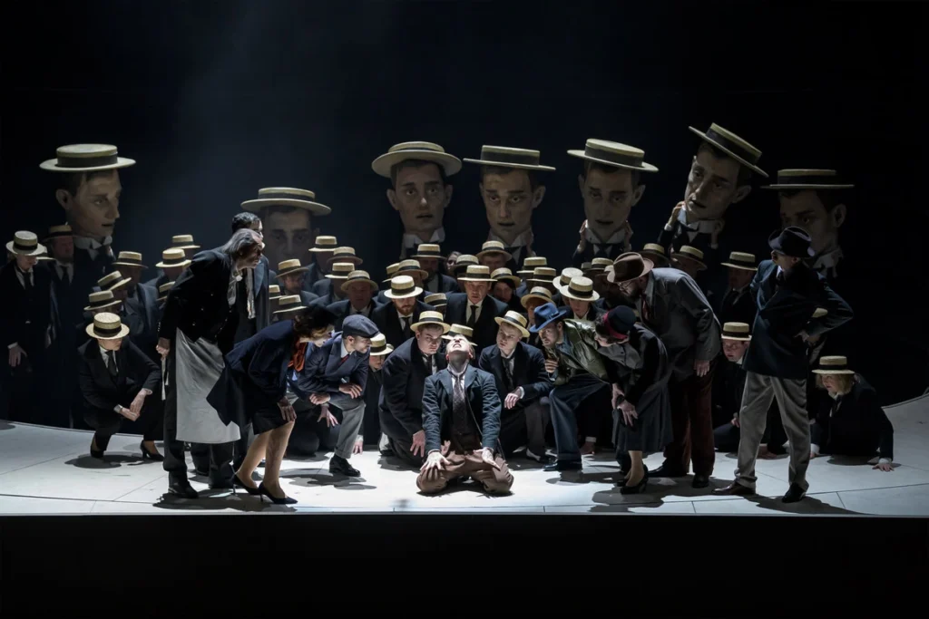Alexander Zemlinsky vytvořil lehkonohé dílko, poměrně svižnou komedii, která poskytuje inscenátorům prostor pro fantazii a pro divadelnost příběhu o krejčíkovi Wenzelu Strapinském, kterého okolí začne obskakovat díky jeho oblečení a díky tomu, že jej v honosném kočáře přivezl jeden Kočí a trošku zlomyslně ho označil jako polského hraběte. Pokud „šaty dělají člověka“, pak by se dalo očekávat, že bude hlavní postava Wenzel Strapinski oblečen opravdu elegantně, aby jej už z prvního pohledu mohli považovat za hraběte. To však zřejmě nebyl záměr inscenátorů – falešný hrabě je, zdá se, oděn tak, jak se on, krejčík, ve skutečnosti cítí. Žádný elegán, jen poměrně dobře oblečený pohledný mladý muž. Kostýmy stylově inspirované dobou dvacátých až čtyřicátých let před druhou světovou válkou jsou tu spíše založeny na vnitřním pocitu a charakteristice jednotlivých postav. Krejčík Strapinski nevyniká elegancí, jeho středně hnědé kalhoty vypadají poněkud unaveně a podporují tak jeho nesmělost a rozpačitost, s níž se poddává obdivu ostatních. Jak později říká (zpívá), on sám nikdy neřekl, že je hrabě a ti lidé mu sloužili, aniž je o to požádal. Bez problémů zapadne mezi kuřáckou partu štamgastů a okamžitě je obklopí téměř neprostupný oblak doutníkového a cigaretového kouře – důvod okamžitého komického vyznění scénky a příspěvek k vytvoření patřičné atmosféry. Jakmile se objeví mladá a půvabná Nettchen, dcera místního rady, situace se zahušťuje. „Hrabě“ a dívka v sobě nacházejí zalíbení a krejčík Strapinski není schopen utéct, aby se vyhnul odhalení. Sbor má zpočátku jednotné kostýmy zčásti dámského a také pánského hotelového personálu. Komedie získává na nadhledu, vynořuje se stále častěji typ Bustera Keatona, nejprve v podobě celohlavových masek osmi černě oděných mladíků, kteří později splynou s unisexovým davem početného sboru v keatonovském odění, tedy v černých oblecích s typickými slamáky na hlavách (kostýmy Julia Katharina Berndt). Zamilovaná dvojice tančí (choreografie Dustin Klein) a komedie spěje k radostnému konci, protože Nettchen se sice nestane hraběnkou, ale ráda přijímá i roli paní mistrové.