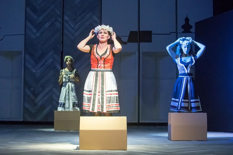 Scénografie Andreje Ďuríka s otočnými mansiony má připomínat České Budějovice. Je záměrně černo-šedo-bílá a pro intimnější scény se přivírají dvoukřídlá černá vrata. Scéna je zahlcena prázdnými krabicemi, které nejsou funkční, občas spíš překážejí. Přepestré kostýmy Tomáše Kypty viditelně slouží režisérovým záměrům, jak to má být. Charaktery postav jsou naznačené, režisér se snaží o fyzické interakce mezi nimi, balet používá někdy jako televizní stafáž (servírování lahvového piva apod.).