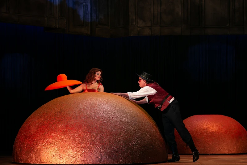 Všechny postavy se střetávají ve středu jeviště spolu se skupinou pohledných siláků a akrobatů Losers Cirque Company, kterou jsme již viděli v inscenaci Brittenovy opery Billy Budd (režisér Daniel Špinar, choreografie Radim Vizváry). Strhávali na sebe hodně pozornosti v rolích Oblud, Opilců, Nenasytů a Ďáblů, byli bonusem v nepřehledné inscenační struktuře, které chybí srozumitelná hierarchie postav i dění. Radim Vizváry tvoří v Pomerančích detaily a poněkud přitom zapomíná na architekturu inscenace a na její srozumitelnost. Tuto vlastnost ostatně projevil už ve své operní prvotině, jíž byla Donizettiho Poprasku v opeře rovněž na prknech Národního divadla. Režisérovi chybí odstup a nadhled nad inscenací. Vytváří ji sice jako „divadlo na divadle“, ale tyto dvě vrstvy od sebe neodděluje – hodí obecenstvo do vody, aniž by je naučil plavat.