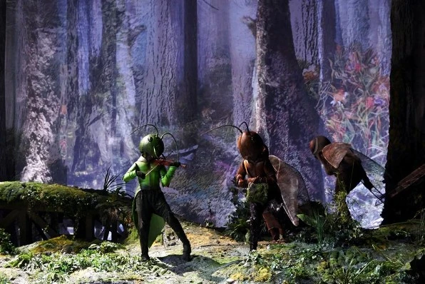 Scénografka a kostýmní návrhářka Amra Buchbinder, která zde debutovala, navrhla pro operu nerovný terén lesní krajiny působící realisticky, magicky a snově. Z technického pohledu je scéna postavena na praktikáblech a opticky tvoří úžasnou organickou jednotu přírody. Jen proměny v prvním dějství a na počátku druhého dějství jsou řešeny několikavteřinovým stažením průsvitné opony, za níž dochází k rychlým změnám a variabilně se mění polohy stromů. Častější stažení opony působí poněkud nadbytečně a teatrálně. Poetický ráz jevištních obrazů inspirovaný bajkami vtáhne hned od prvních taktů do opery děti i dospělé.