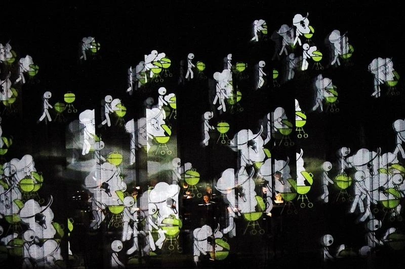 Inscenovat dílo, které nemá děj a u nějž chybí nějaký odrazový můstek nebo klíč ke scénickému řešení, dává tvůrcům zdánlivě úžasnou svobodu. Ta se ale může stát i pastí. Původní verze Lost Objects se odehrávala na jakémsi lešení, na němž stáli všichni účinkující, a spojovala světelný design, projekci i hereckou akci. Národní divadlo se rozhodlo neotřele pověřit režií dvojici výtvarníků se zkušenostmi s multimédii: Michaela Bielickyho a Kamilu B. Richter. Nejsem schopen říci, kde vedla hranice mezi jejich podílem a vkladem scénografa Jana Hladila. Veškerá divadelnost totiž spočívala v pruzích průhledného materiálu visících před sborem a sólistkami na scéně, zatímco orchestr byl usazen v „díře“ pod nimi. Na tyto pruhy se promítaly animace a díky jejich rozmístění v různých vzdálenostech od publika byly rozprostřeny do hloubky. Základem animace byly jednoduché piktogramy, jež se pohybovaly různými směry, občas synchronizovaně s hudbou, občas nezávisle. Obrázky samy o sobě byly docela hezké, práce s nimi již ne. Ta se omezovala na poletování jejich shluků ze strany na stranu, víc se toho před našima očima neodehrávalo. Několikrát byly promíchány s rámečky textů, údajně živě přebíraných z internetu. Také témata obrázků byla volena podivně. Občas doslovně ilustrovala text: zpívalo-li se o ztracené ponožce, padaly v projekci ponožky atd. Pak se ale animace od textů zcela odpoutaly, jako by se autoři rozhodli vsadit na chytlavé zkratky a naznačování přesahu k aktuálním politickým tématům. Dočkali jsme se tak červených trenýrek vlajících nad pražským hradem, postaviček s turbany a tureckými šavlemi, postaviček s ovčími hlavami, mobilními telefony místo hlav, explozí, „iluminátského“ vševidoucího oka, tučňáků i ledních medvědů. Posunul se tak smysl hudby a textu na nějakou novou úroveň? Nikoliv.